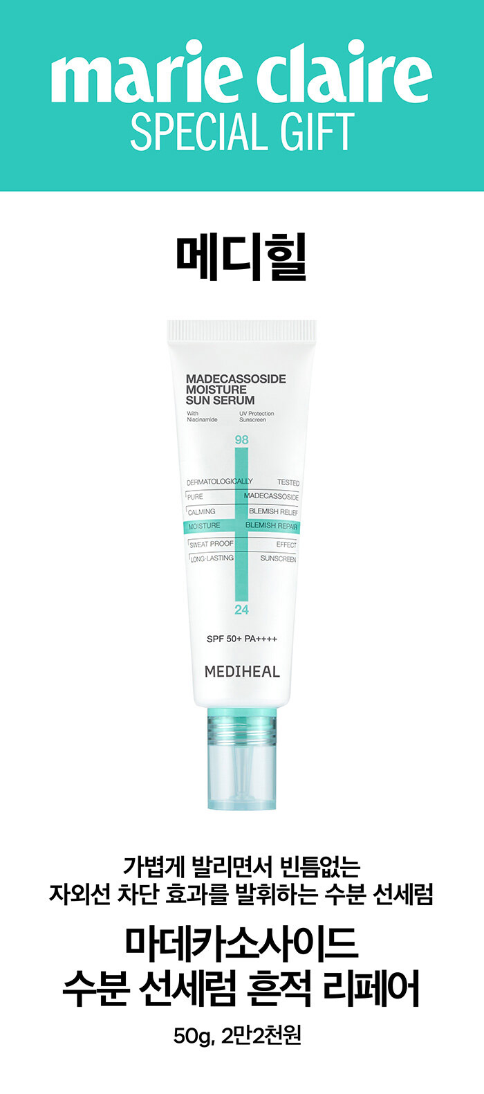 *Pre Order Benefit : MEDIHEAL MADECASSOSIDE MOISTURE SUN SERUM SPF50+ PA++++ 50g + LEE KNOW POSTER & BOOKMARK